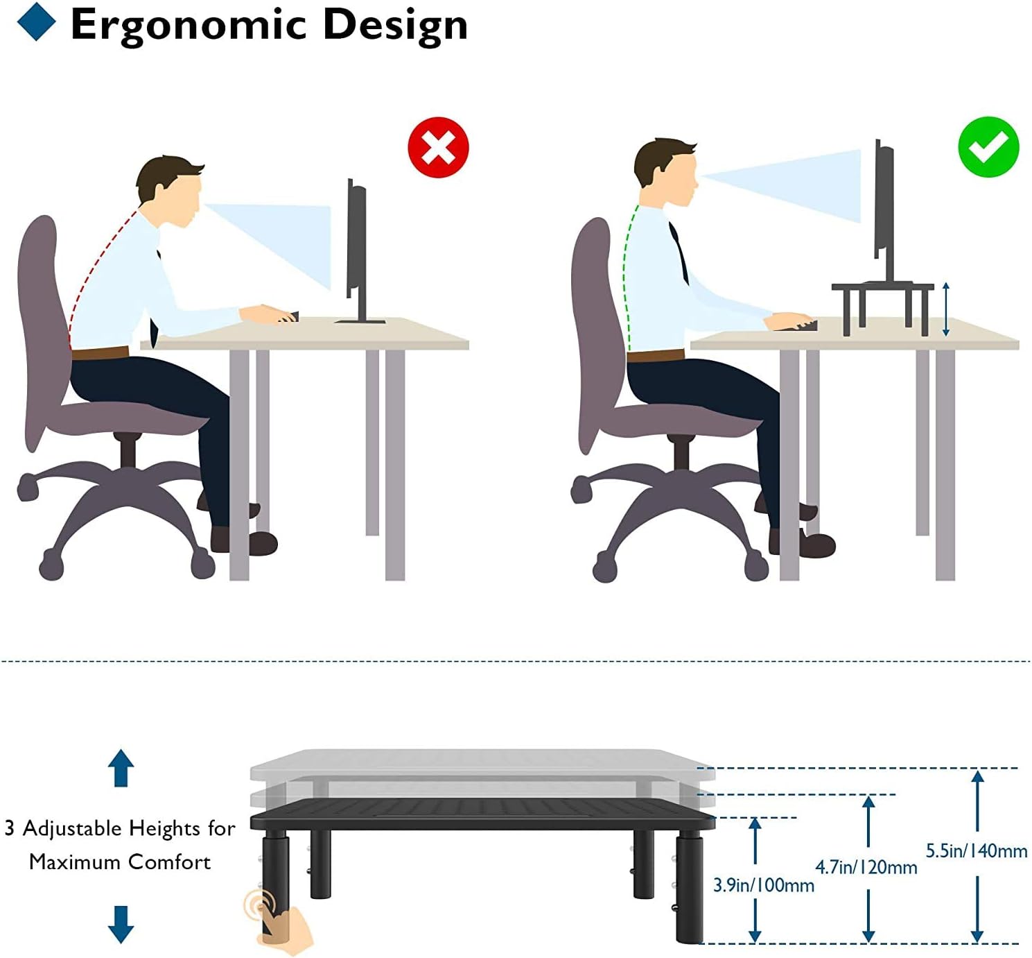 With three adjustable height levels, this monitor stand allows you to customize your setup to suit your needs. The built-in pen holder keeps your writing utensils within reach, while the cable management system helps keep your workspace organized and clutter-free.